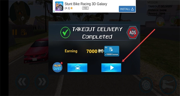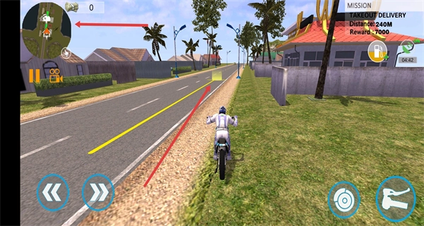 按照左上角地图的指引操控摩托车,前往指定地点完成外卖领取流程。