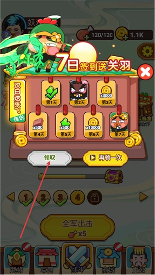 在7日签到送关羽的活动页面里,点击领取按钮,就能拿到第1天对应的签到奖励,参与这个签到活动可以逐步解锁后续的奖励。