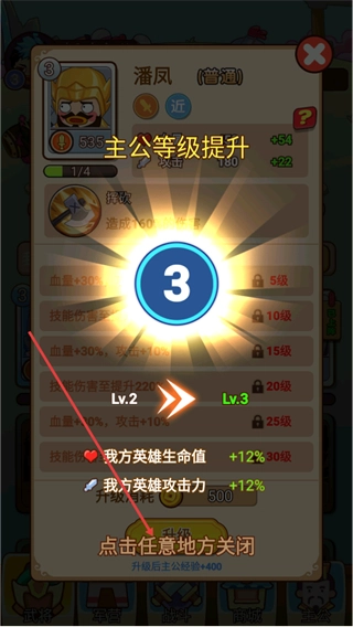 武将升级后会弹出主公等级提升的提示界面,点击该界面的任意位置,就能关闭提示并回到武将详情界面。