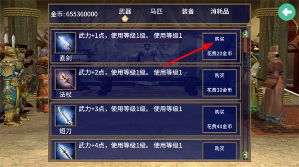 在商店界面里,点击购买按钮就能得到武器,像直剑可以增加1点武力值,你可以依据战斗的实际需要挑选合适的武器。