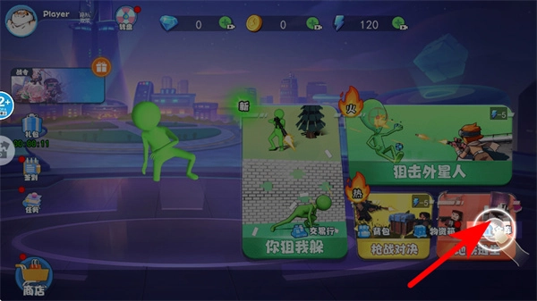 进入游戏主界面后,点击红色箭头所指的仓库按钮,进入武器管理界面,这是准备战斗装备的关键操作。