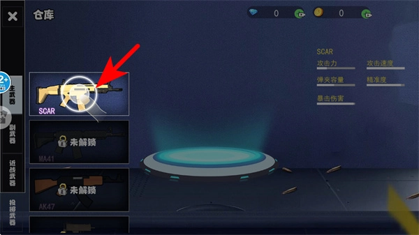在仓库里,按照红色箭头的指示,挑选像SCAR这类可用的武器,查看它的属性详情来确认是否适配装备。
