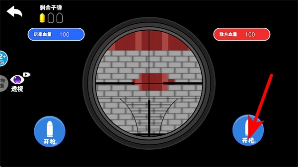 进入战斗界面后,按照红色箭头的指引,点击开枪按钮来攻击敌方目标,通过消耗子弹来推动战斗进程。