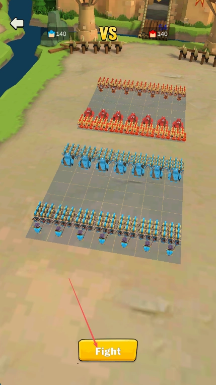 进入游戏后,查看得知敌我双方的兵力都是140,接着点击箭头指向的Fight按钮,战斗就会开始。