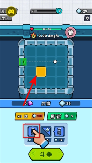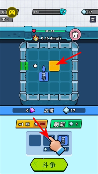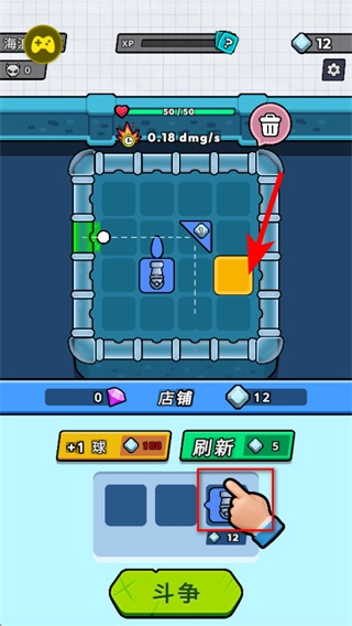 进入游戏界面后,点击红色箭头所指的道具选项,消耗钻石把它布置到方格内的目标区域,这是开启道具战斗玩法的关键步骤。