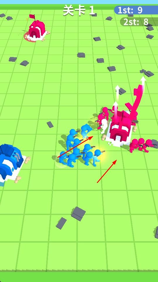 指挥蓝色方块阵营的士兵,对敌方红色方块人及其建筑发动攻击,与敌人展开战斗并消灭敌方单位。