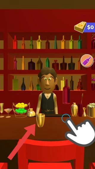 结账后,调酒师需要开始调酒,现在正处于新手教程阶段,玩家可以按照提示操作,点击调酒杯。