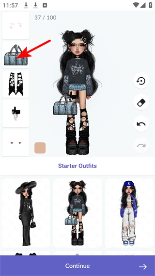 按照箭头所指的方向,点击左侧栏里的配饰(比如手提包),就能把它搭配到现在的造型中,让装扮的细节更丰富。