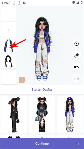 按照红色箭头的指引操作,点击左侧栏中的外套等服饰部件,通过更换对应的单品,来调整整体的穿搭风格。