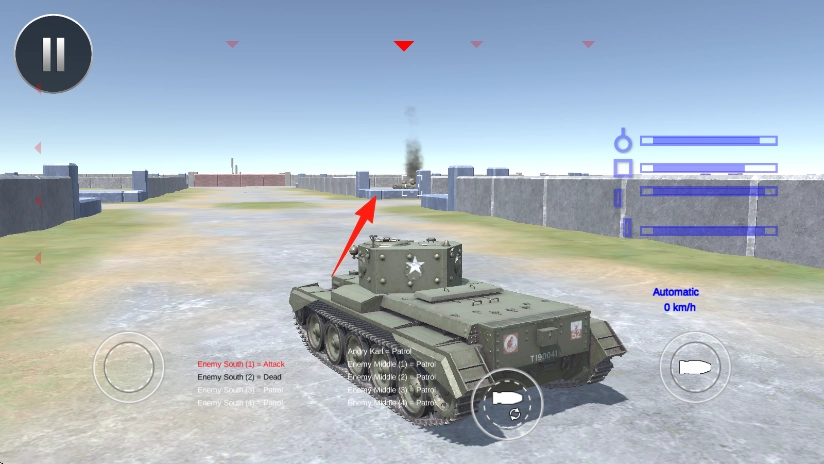 进入关卡后,你将驾驶带有绿皮、白星标识的美军坦克,红箭头会指向敌方坦克的位置;左侧的虚拟摇杆用于操控坦克移动,右侧的按键则负责射击操作。