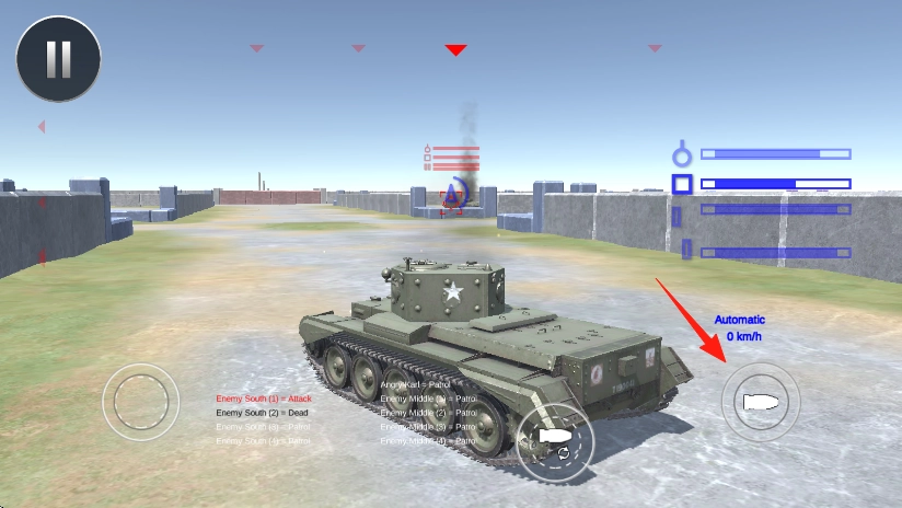 战斗时,若敌方坦克现身,需点击右侧射击键的子弹图标,瞄准带有红箭头的目标发起攻击;与此同时,留意右侧的蓝色进度条,并借助地形进行掩护。