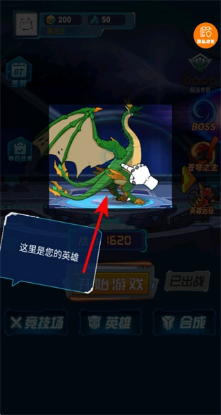 进入游戏后,点击像绿色巨龙这样的英雄,就能查看他们的属性与技能,从而知晓英雄的战力状况,为后续制定战斗策略提供帮助。