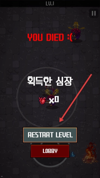 当角色死亡时会显示“YOU DIED”,此时点击“RESTART LEVEL”按钮即可重新开始当前关卡,你可以调整策略后再次挑战地牢。