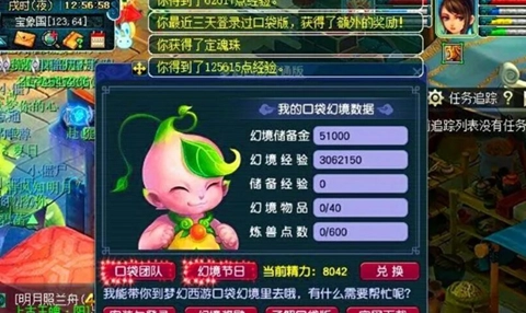 梦幻西游在每个月的9号的时候是口袋幻境节。各位玩家可以去宝象国找葫芦精灵去答题,总共就10道题目,答对以后可以获得经验奖励,而且大家如果在最近的三天内登录过口袋版,获得的奖励还是翻倍的,除此之外,大家在答题的时候也有一定的几率会获得额外的道具奖励,上面的这位玩家现在就答题获得了一个定魂珠的道具奖励。点点鼠标就能拿到的奖励,谁不做就有点傻了。