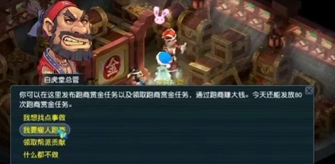 跑商:跑商是梦幻最原始最有效收益较高的一种获得帮贡的方式,但是由于需要频繁的操作,买卖货物,显得非常繁杂,如果回长安的时候银票差了一点钱,简直叫人抓狂!不过跑商能给帮派带来大量的资金,可以让帮派持续稳定的发展,所以在这里建议单开玩家可以跑商
