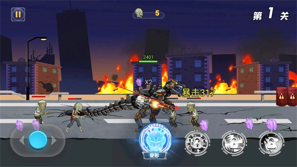点击变形按钮,触发机甲技能,对僵尸造成大范围伤害,快速清除剩余敌人,推进关卡进度。