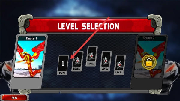 点击【PLAY】按钮进入游戏后,选择“Chapter1”下的“LEVEL-1”关卡,操控机器蛇变形为机甲形态,开启沙漠场景的战斗。