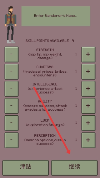 在角色创建界面,为各项技能(例如智力等)分配点数后,点击【继续】按钮,即可进入荒原开启生存冒险之旅。