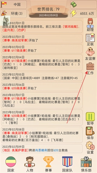 点击工作按钮,处理足协相关事务,像球员注册、教练聘请之类的,来提升足协的运营状况。