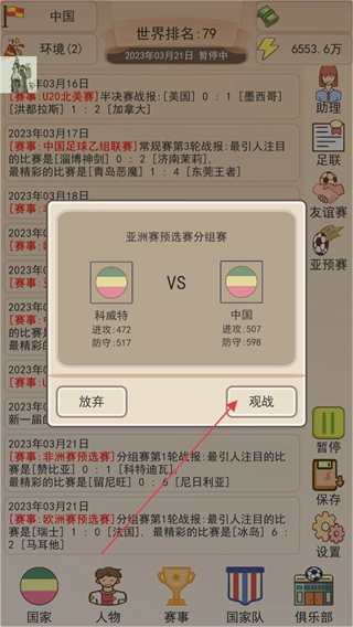在亚预赛这类赛事里,点击观战按钮,就能查看像中国对阵科威特这样的比赛的实时数据和进程。