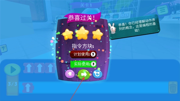 当孩子拖拽组合指令后,兔子会立即执行相应任务;一旦成功修复系统或达成目标,孩子就能获得直观反馈,从而快速建立成就感,进一步提升持续参与的积极性。