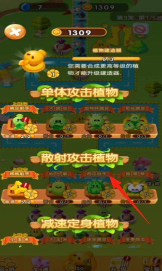 植物合成系统借助合成功能(粉色花盆)来提升植物等级,解锁“散射攻击植物”这类新的植物类型,从而增强整体战斗能力。
