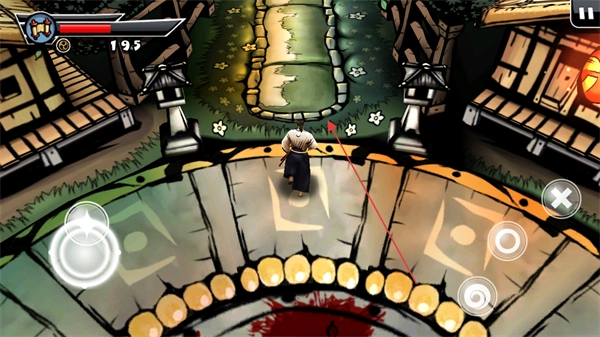 战斗结束后,操控武士移动,前往新的场景区域,探索不同地图如花园小径、水上平台等。