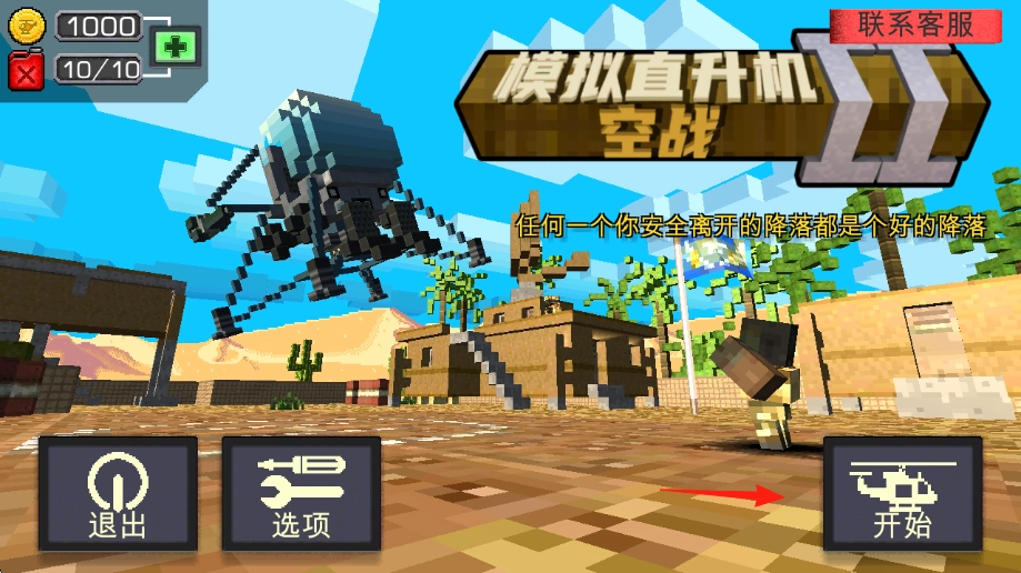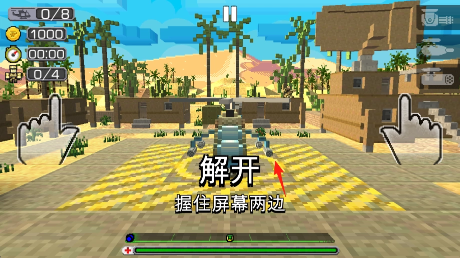 点击【开始】按钮(即红箭头所指处),进入沙漠场景后,按照提示,用双指分别按住屏幕两侧并滑动,以此操控直升机,完成“解开”环节的教学任务。