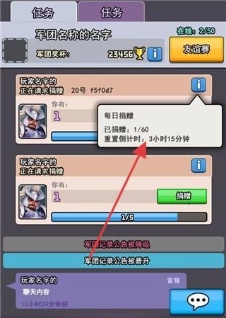 军团任务界面会展示“军团名称的名字”,成员“玩家名字”可发起“请求捐赠”,界面还包含“每日捐赠”进度以及重置倒计时,该界面主要用于军团协作与资源互助。