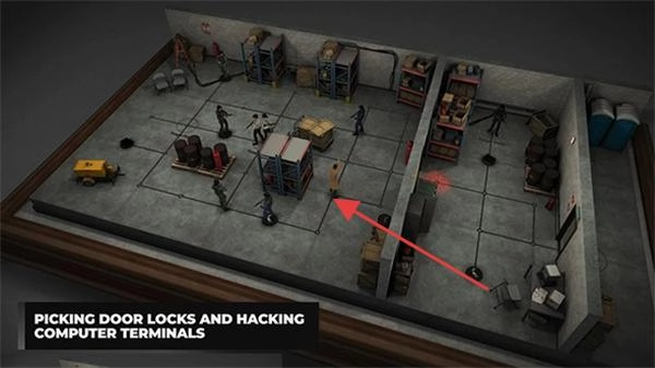 仓库场景中,包含“撬门锁、黑入电脑终端”这类玩法,着重呈现潜入、解谜等需要策略性操作的环节。