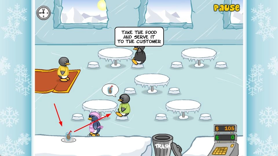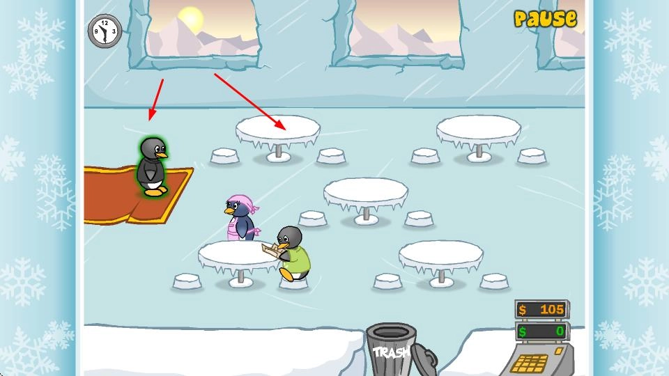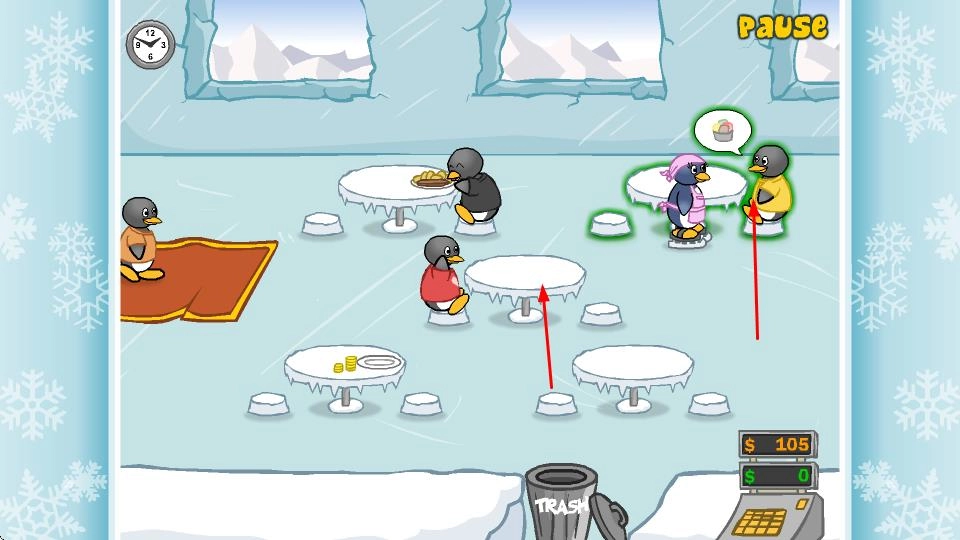 当有像绿色边框标识的企鹅这类顾客进入餐厅时,要引导它们到空餐桌就座,以便为服务顾客做好准备。