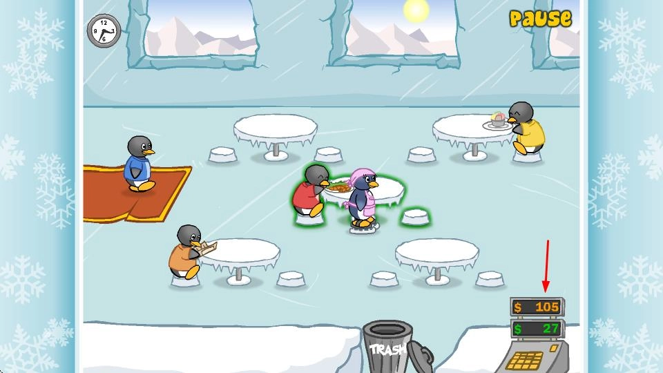 服务流程的精准操作体现在:通过点击屏幕完成企鹅顾客的座位安排、点餐记录、食材搭配烹饪以及送餐结账等环节,全程需要把控好时间节奏,快速响应举手示意的顾客,防止因冷落他们而导致满意度降低。