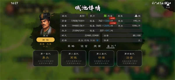 城池操作涵盖出征、建设、军事部署三大方向:农场增粮、伐木场敛财、种植园产特货,皆为经济根基;城墙、箭塔、拒马等防御工事按需布设,陷阱属一次性消耗型设施;太守人选兼顾智政与武统特长,郡尉侧重郡城战力加成,郡丞则专司府城资源产出优化;佐官配置与城池等级相匹配,方能发挥最大治理效能。