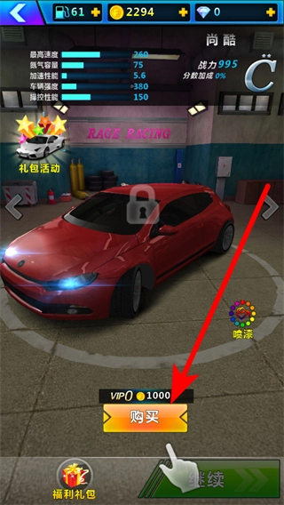 进入后,要是有可以购买的赛车,就按照提示花费金币点击购买,这样就能得到新赛车,进而增强战力和驾驶体验。