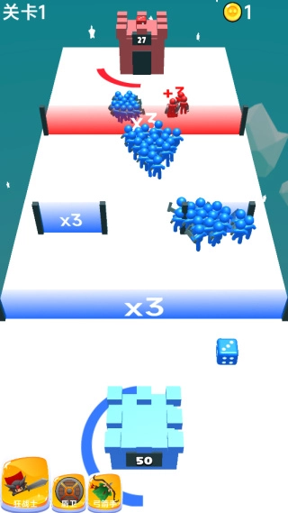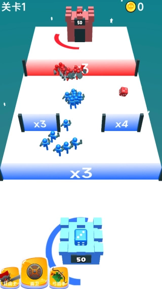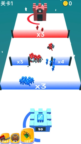 2、与敌方士兵展开对抗时,你可以自由招募不同类型的兵种,并且通过进入强化门来增加己方的士兵数量。