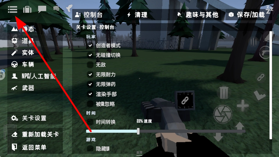 点击菜单按钮,可打开包含控制台、清理等功能选项的菜单,进而执行关卡设置等各类操作。