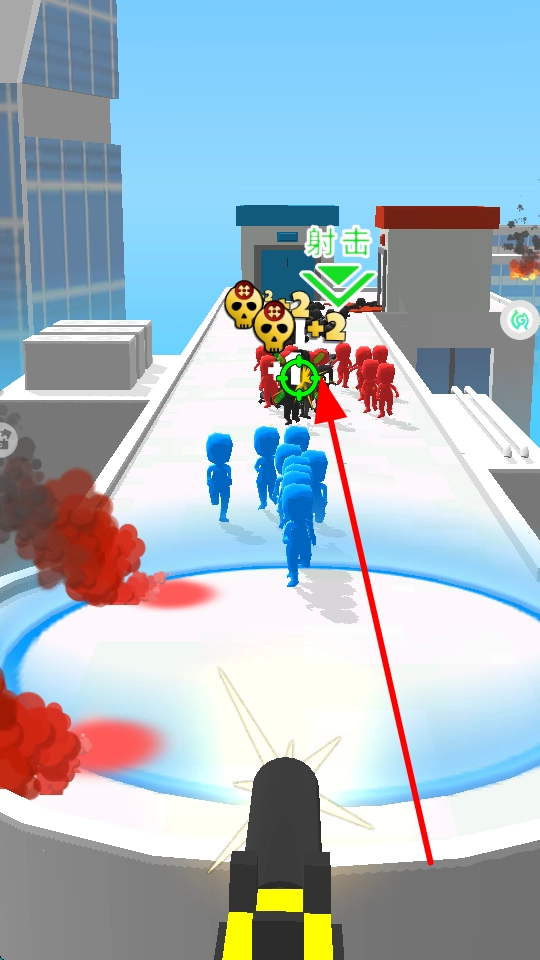 滑动屏幕精准锁定敌人,随后果断开火,清除红色敌人,守护蓝色小人安全前行。