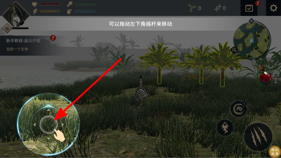 在游戏场景里,拖动左下角的摇杆就能操控恐龙移动,你可以自由探索这个世界,去寻找需要的目标生物或者资源。