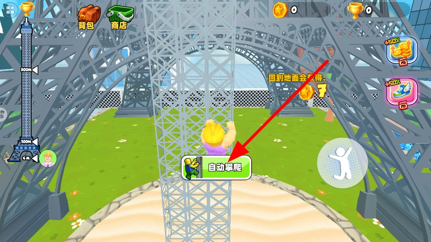 当遇到能够攀爬的结构时,点击自动攀爬按钮,角色便会自动执行攀爬动作,朝着高处移动,从而开启攀爬挑战的流程。