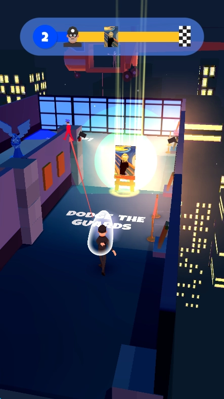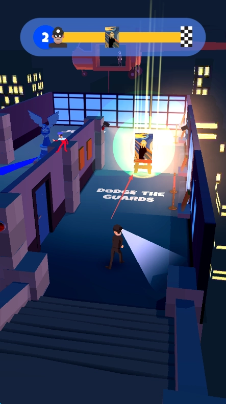进入游戏后,看到上方显示数字2,清楚需要躲避守卫来完成任务,要留意场景里守卫的探照灯,提前规划好行进路线。