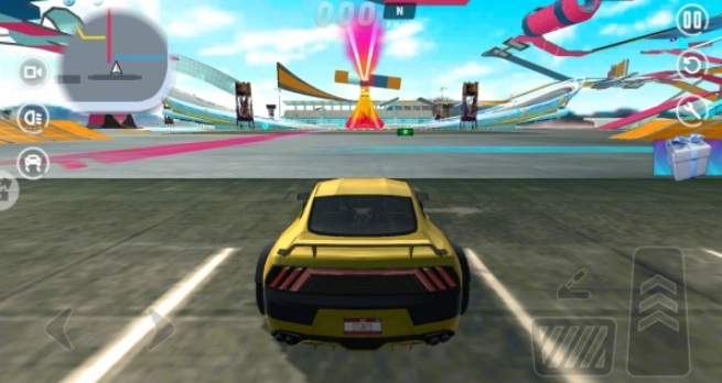 3、借助虚拟方向盘与特技按键操控赛车,实现加速、漂移以及空中翻转等动作。
