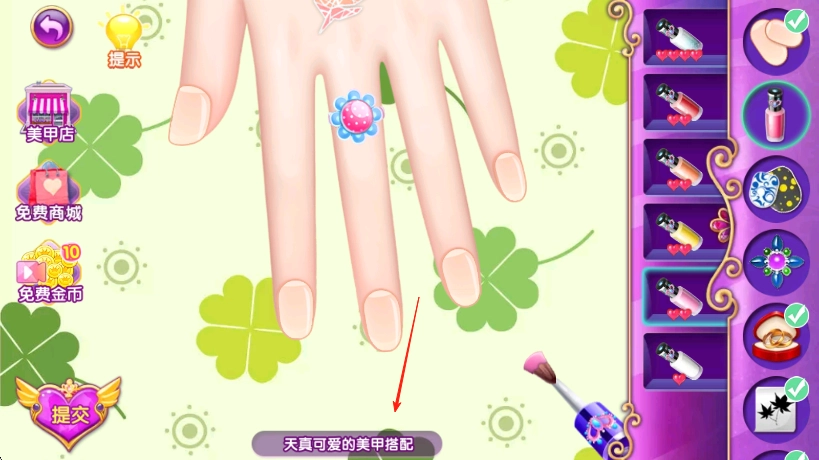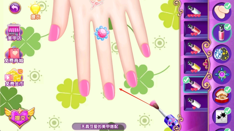 挑选好指甲油后涂抹于指甲表面,完成上色环节,也能搭配戒指之类的饰品,全部就绪后点击提交按钮。