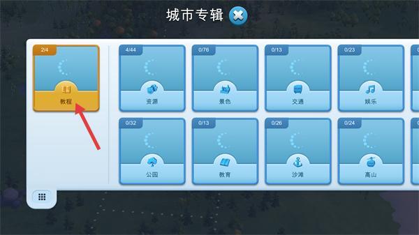 2、进入【城市专辑】界面后,选择【教程】分类,就能查看城市建设各个模块的引导内容,从而熟悉相关玩法。