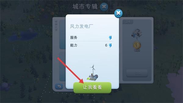 4、点击【风力发电厂】弹窗中的【让我看看】按钮,可进一步了解该设施的【服务】【能力-6】等属性。