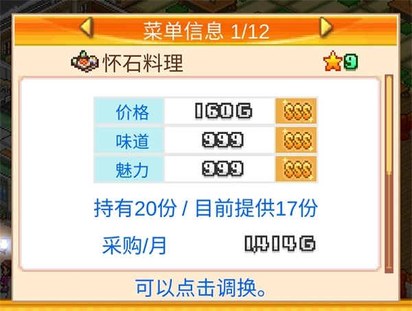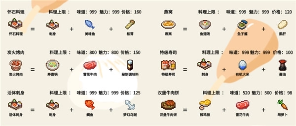 3、菜品价格由八维图数值直接决定,每种食物都有自身的价格、味道、魅力上限,所以在菜品研发时,选择上限高的菜品通常能达到事半功倍的效果!
