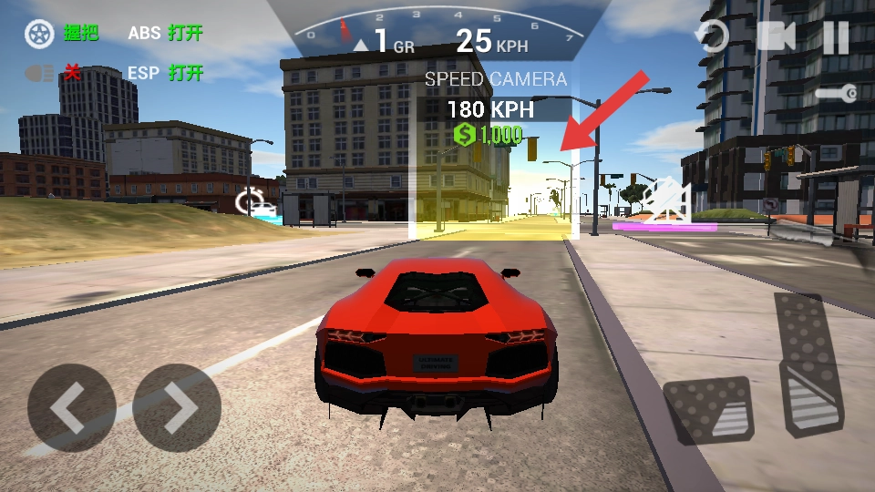 驾驶红色赛车时,注意前方的SPEED CAMERA测速区域,把车速提升到180KPH,成功通过就能获得1000美元的奖励。