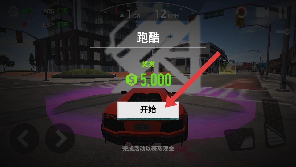 驾驶到紫色任务区域后,跑酷任务界面会自动弹出,点击开始按钮即可参与跑酷活动,完成挑战就能获得5000美元的奖赏。