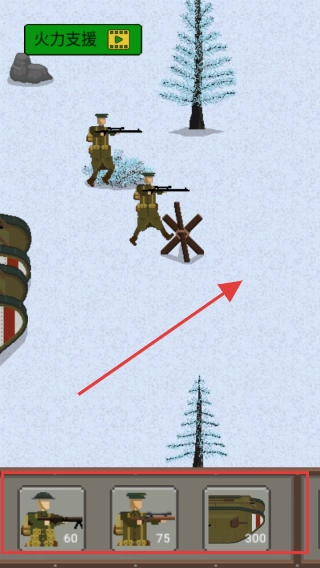 通过点击红色方框里的虚拟按钮来召唤士兵,以此达成游戏任务,进而获得游戏分数与奖励,不断积攒游戏资源,最终实现角色能力的提升。