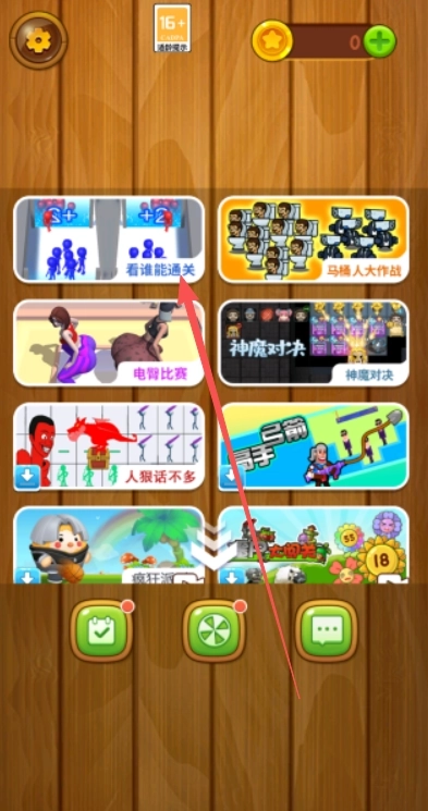 1、 进入游戏后,你会看到多种不同的游戏模式,选择“看谁能通关”这一模式。