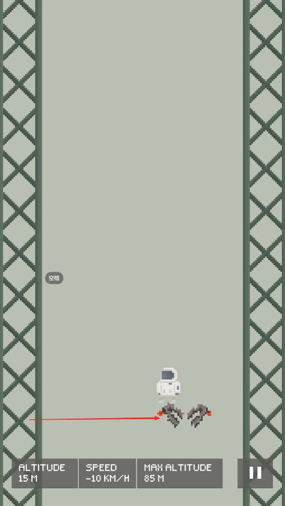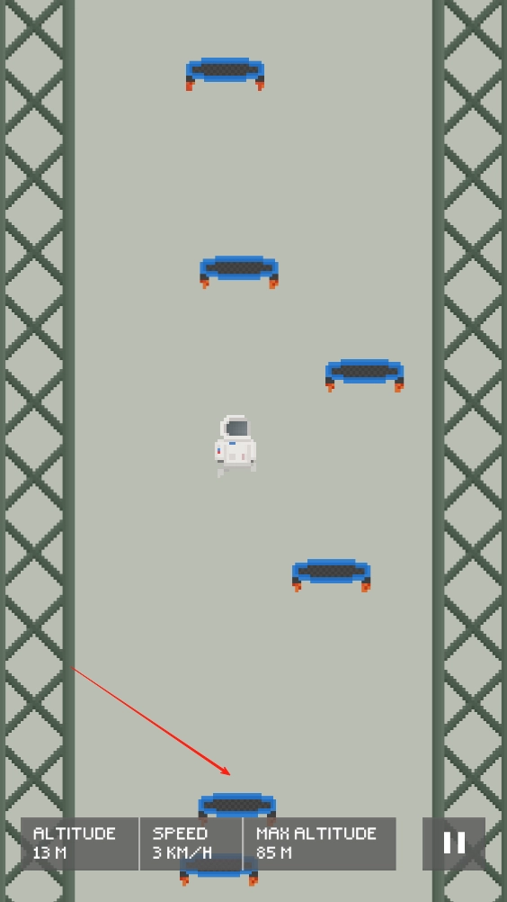 精准操控蹦床弹力:点击屏幕即可控制蹦床弹力的释放,关键在于航天员下落的瞬间完成触发,借助反弹力将其向上推送,而力度与时机的精准把控,会直接决定最终的升空高度。